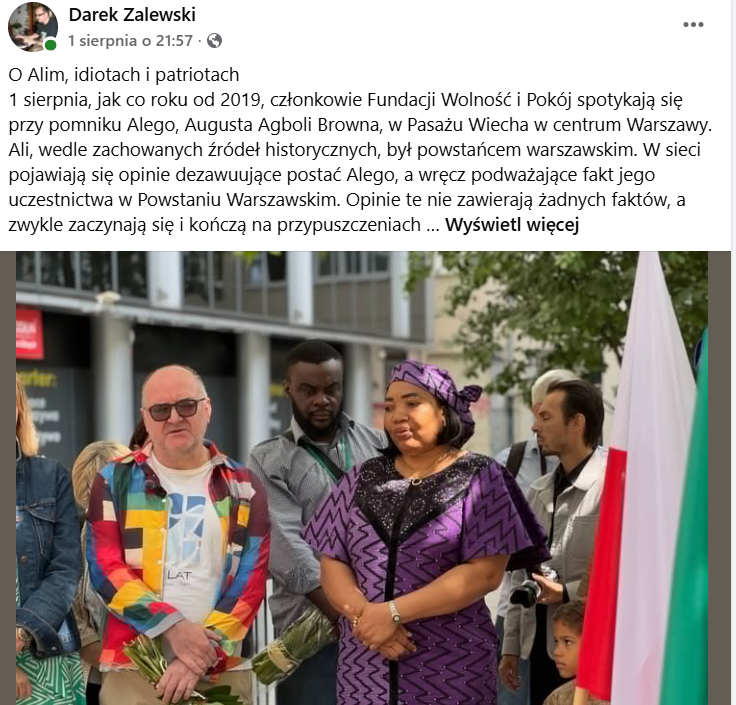 Dariusz Zalewski, naukowiec i były działacz zrzeszania Wolność i Pokój od lat działał na rzecz upamiętnienia postaci Augusta Agboli Browna „Alego”. Pochodzący z Nigerii uczestnik Powstania Warszawskiego od kilku lat (dzięki staraniom fundacji WiP) ma swój pomnik w centrum stolicy. Co roku organizowane są uroczystości na jego cześć, z udziałem także ambasady Nigerii. Smucą (choć niestety nie zaskakują) podane przez Dariusza Zalewskiego informacje o internetowych komentarzach podważających udział postaci „Alego” w Powstaniu.