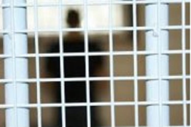 Rozmazana postać za białym ogrodzeniem z siatki drucianej.